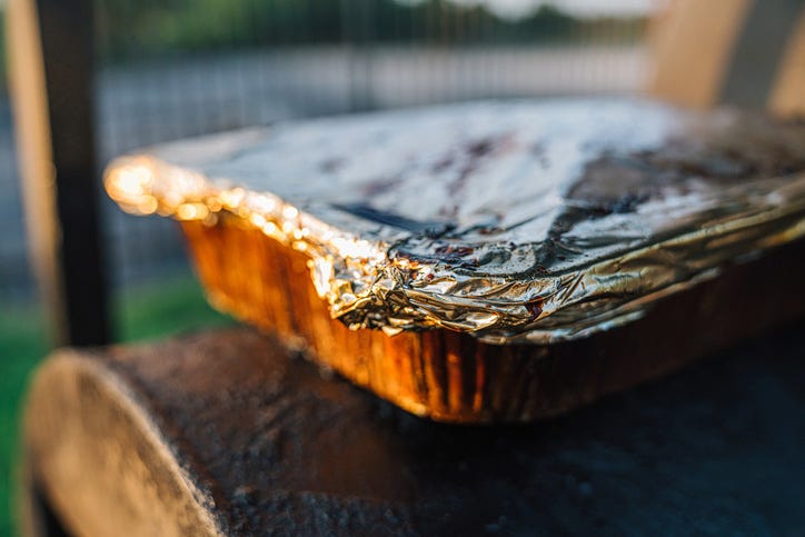 I looked at my watch. Two. I needed to speed things up. Into the kitchen for wide sheets of heavy-duty aluminum and latex gloves. Carefully wrapped the brisket and threw in more wood to crank the temperature up.