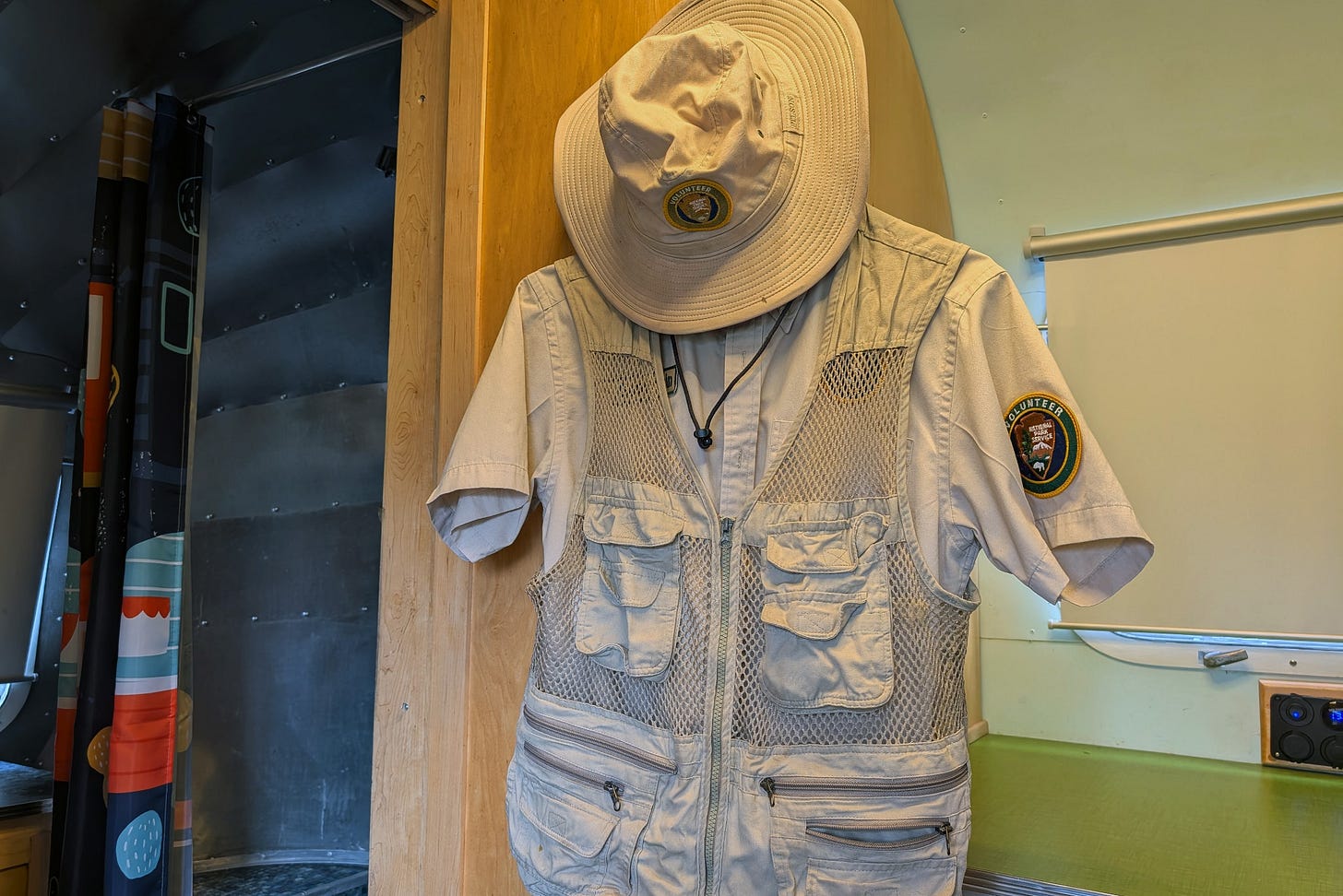 Then he started to put on his gear. Floppy hat with a “National Park Service Volunteer” logo. Radio. A tan mesh vest festooned with pockets.